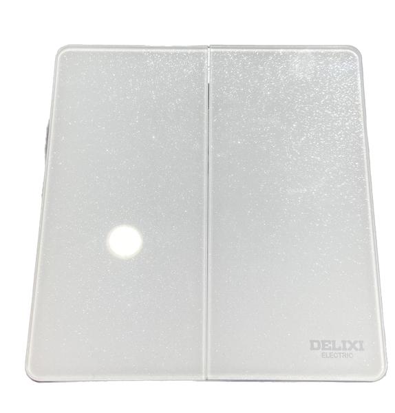 Interrupteur blanc brillant avec effet pailleté visible, équipé de deux boutons pour allumer ou éteindre vos appareils. Design moderne et décoratif, parfait pour tout intérieur contemporain.